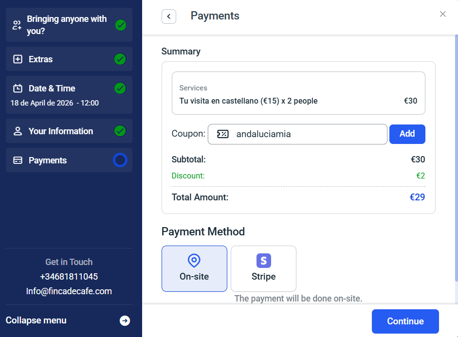 Una buona notizia: ho parlato con Manolo, se inserite «andaluciamia» al momento della prenotazione, avrete uno sconto del 5% 🙂 . Guardate nella foto qui sotto dove va indicato: